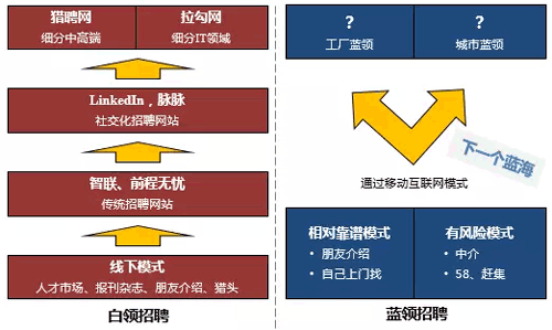通過(guò)分析整個(gè)招聘行業(yè),我們看到白領(lǐng)招聘已經(jīng)互聯(lián)網(wǎng)化并進(jìn)入細(xì)分競(jìng)爭(zhēng)階段。由于智能手機(jī)的普及,藍(lán)領(lǐng)招聘剛剛進(jìn)入移動(dòng)互聯(lián)網(wǎng)化的窗口期,尚未有成型的玩家出現(xiàn)。信息源:揭陽(yáng)人才網(wǎng)_www.dwnfsc.com